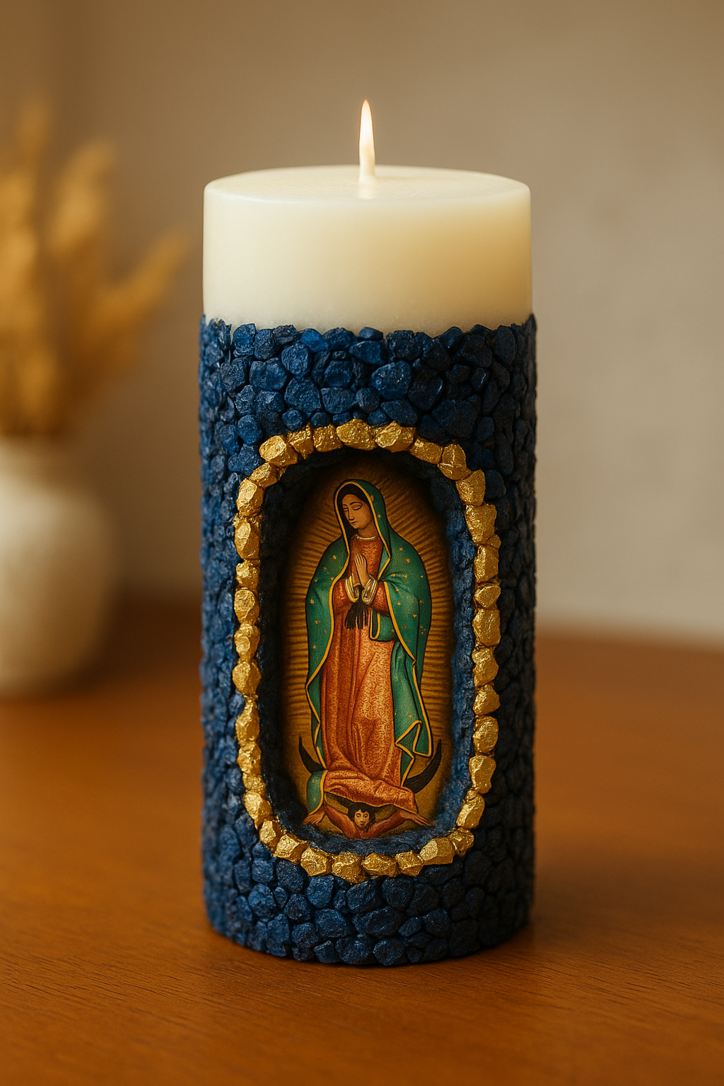 Una vela que representa fe, protección y amor maternal. Inspirada en la devoción a la Virgen de Guadalupe, creada con piedras naturales y luz de oración.