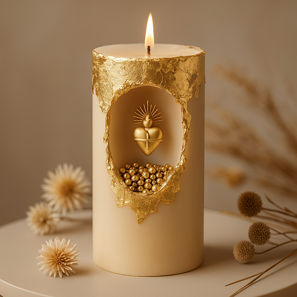 El dorado no es solo belleza: representa la luz divina que guía, protege y eleva cada oración. En esta vela, la hoja de oro se funde con la cera como símbolo de fe, pureza y presencia sagrada